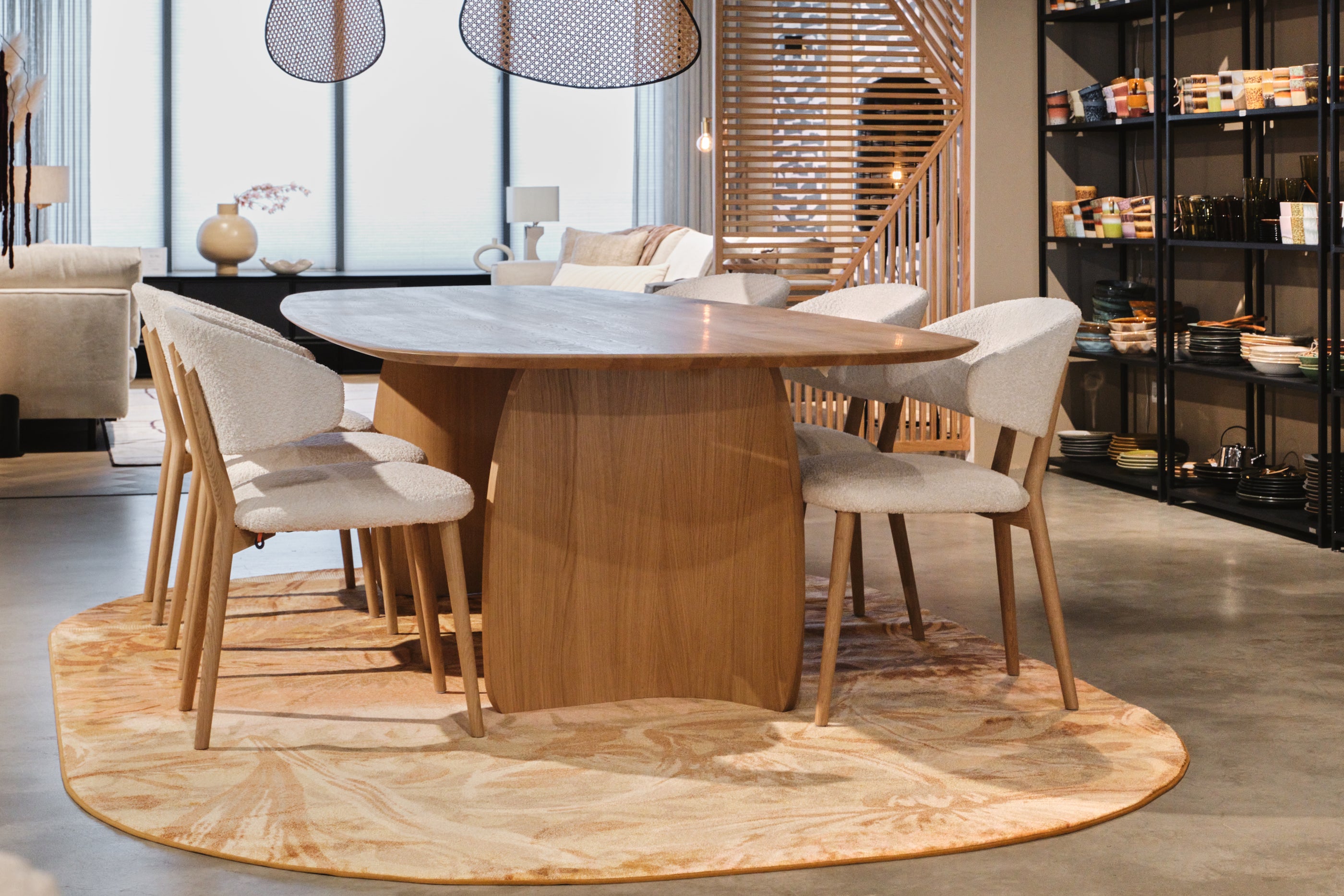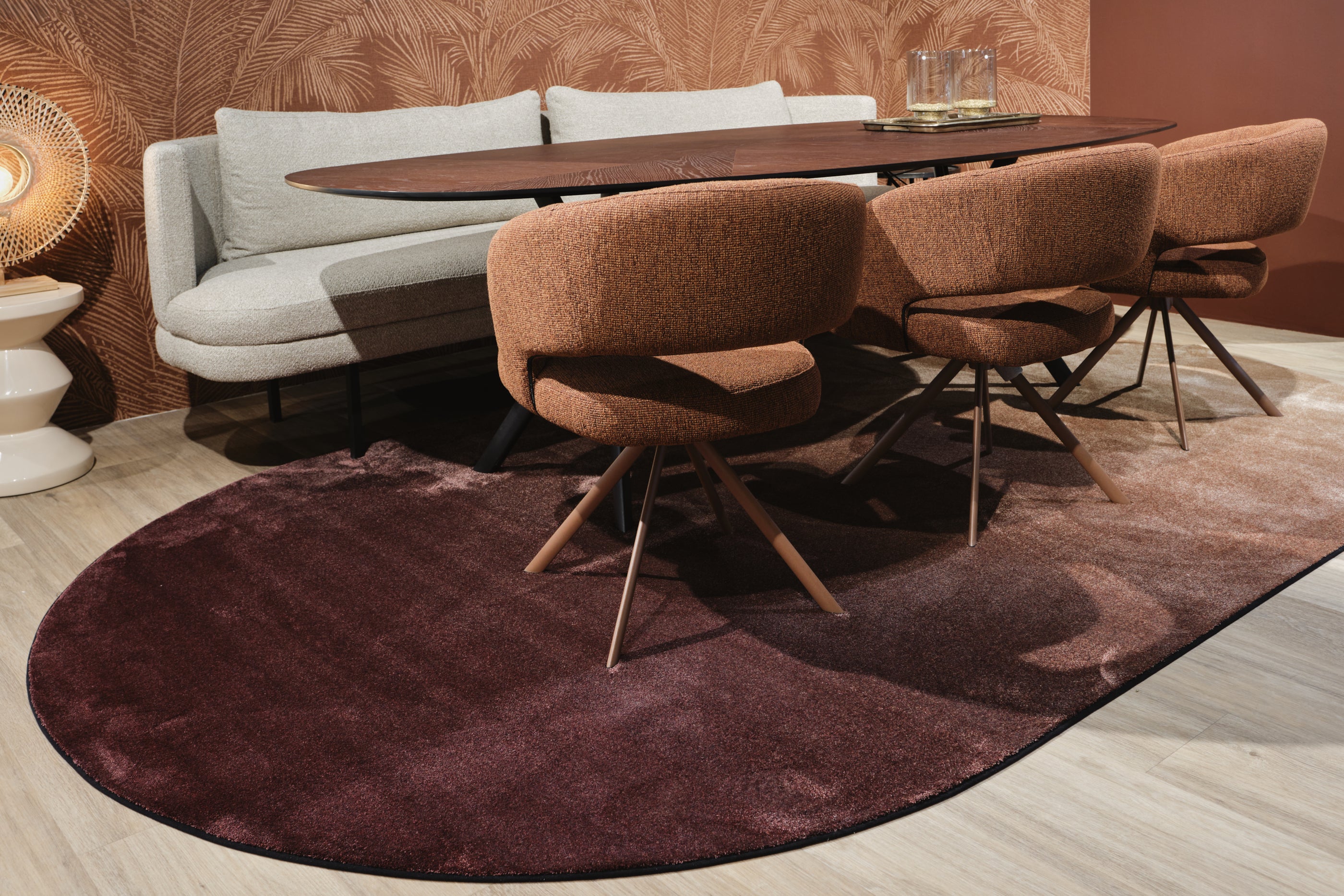 Een ovaal vloerkleed onder een organische tafel zorgt voor een harmonieuze en stijlvolle uitstraling in je interieur. De vloeiende vormen sluiten perfect op elkaar aan en creëren rust en balans in de eetkamer.