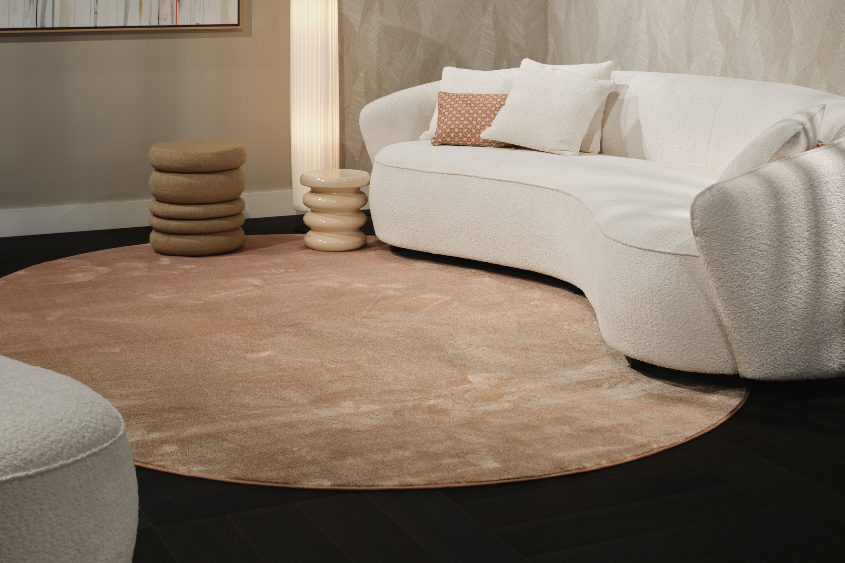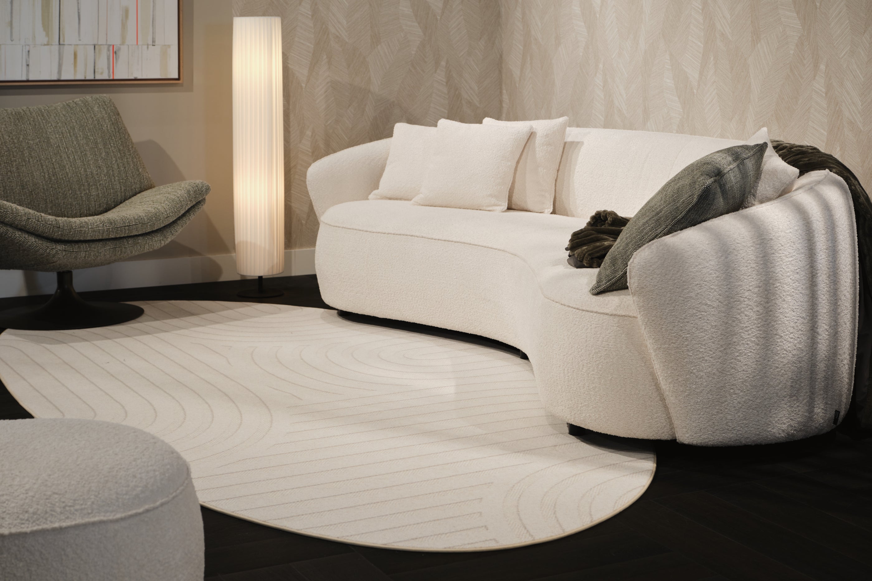 Een rond vloerkleed in combinatie met een zitbank creëert een ruimtelijk en stijlvol middelpunt in de woonkamer. Door het royale formaat verbindt het vloerkleed de bank met de rest van de zithoek en zorgt het voor een zachte, harmonieuze uitstraling.