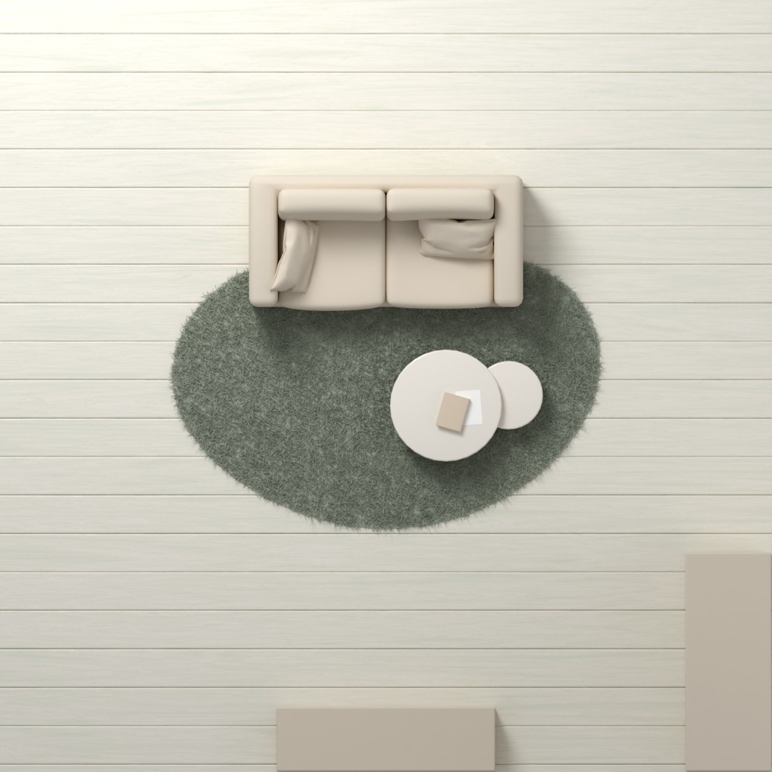 Een organisch vloerkleed in pebble-vorm onder een tweezitsbank zorgt voor een zachte, moderne uitstraling in de woonkamer. De vloeiende lijnen doorbreken strakke vormen en maken de zithoek speels en stijlvol.